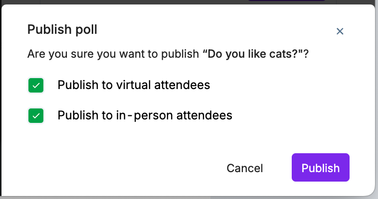 For hybrid events, if the merge engagement is toggled off, you are shown the following prompt when publishing a poll.