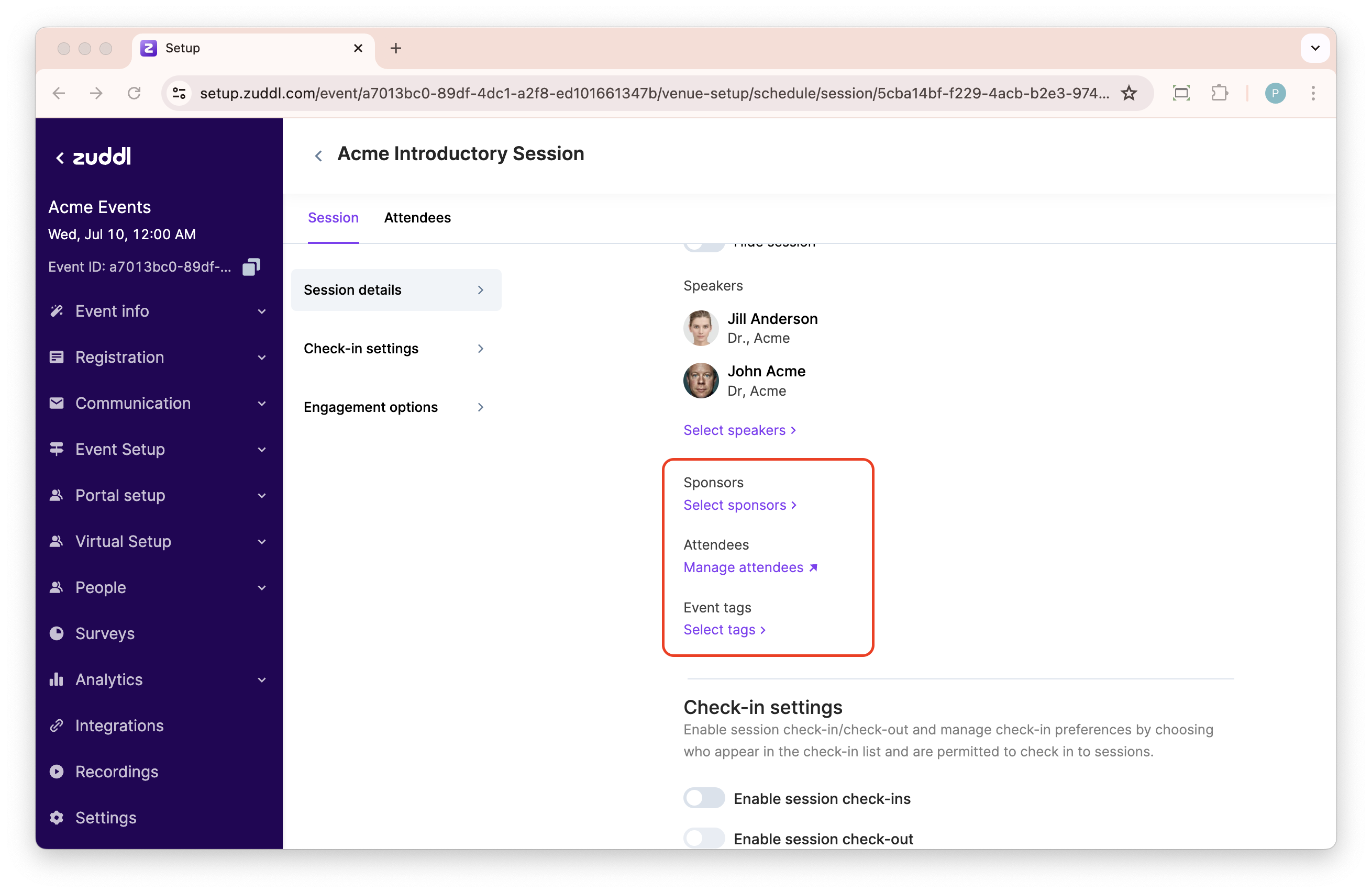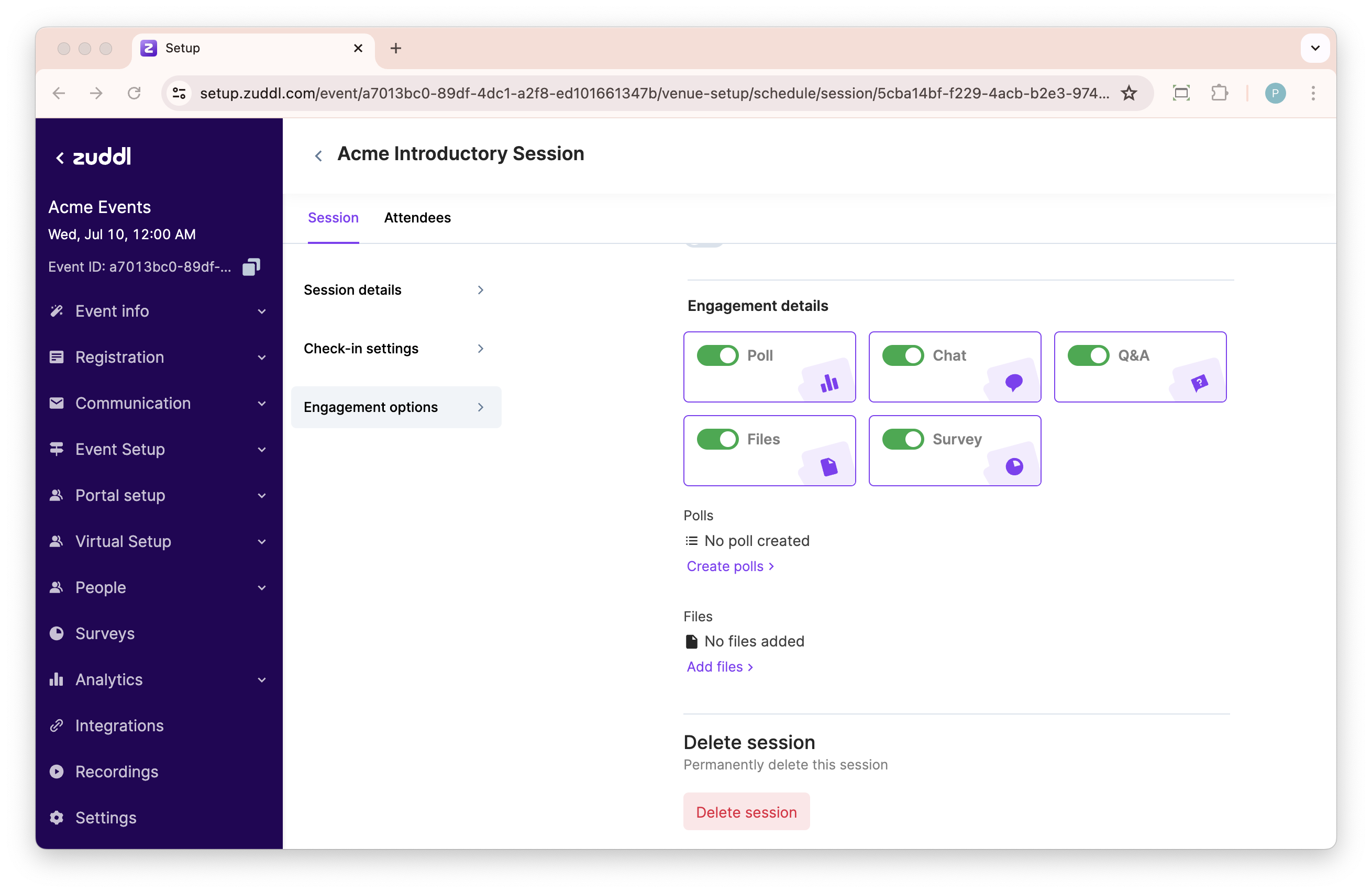 Once you've created a session, you can configure it further with more settings. The session settings are divided into 3 categories namely; Session details, Check-in settings, and Engagement options.