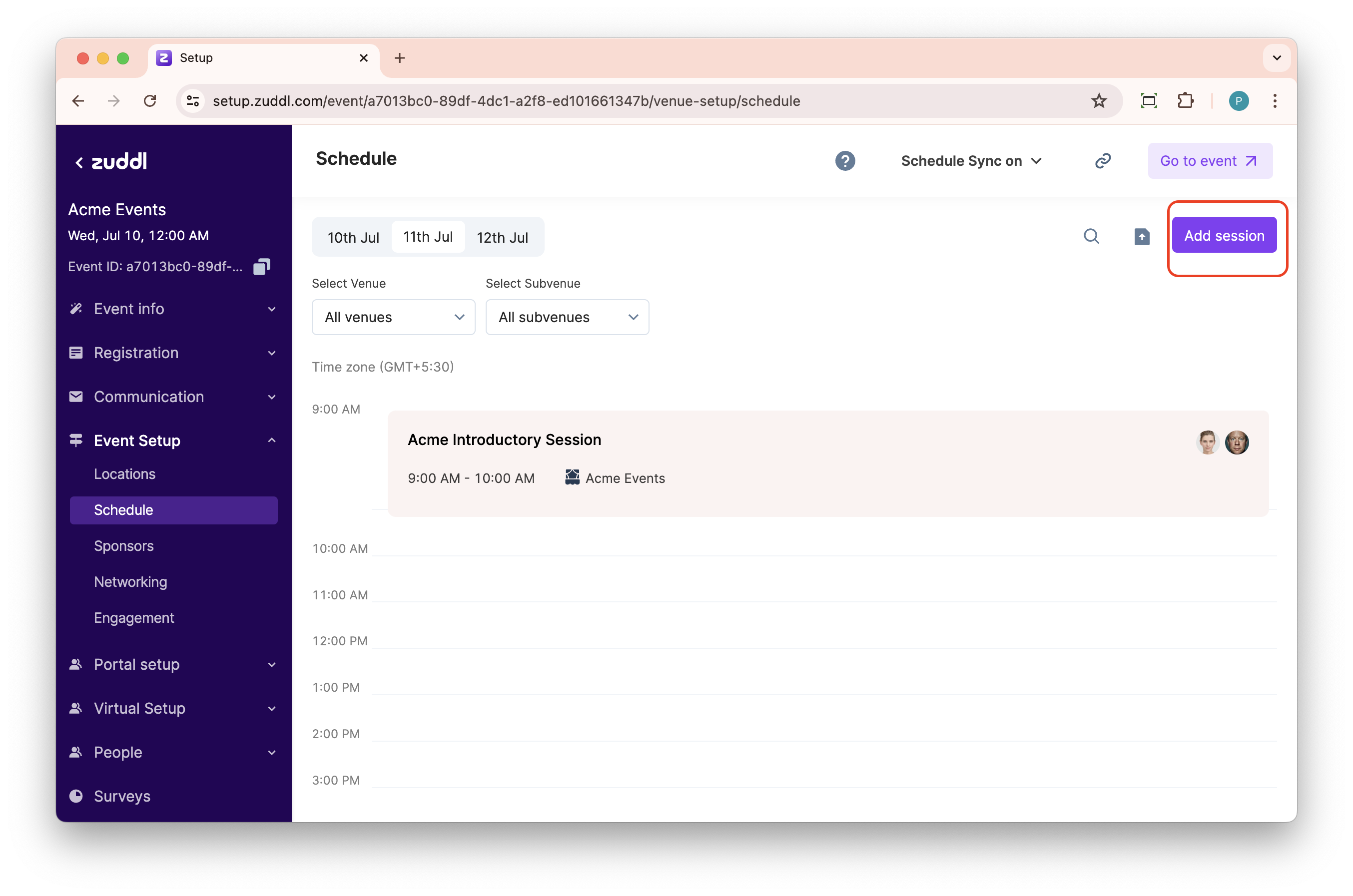 On the session listing page, click on the search icon and enter the session or speaker name to search for a particular session. You can also filter the list using the Select Venue and Select Subvenue dropdown.