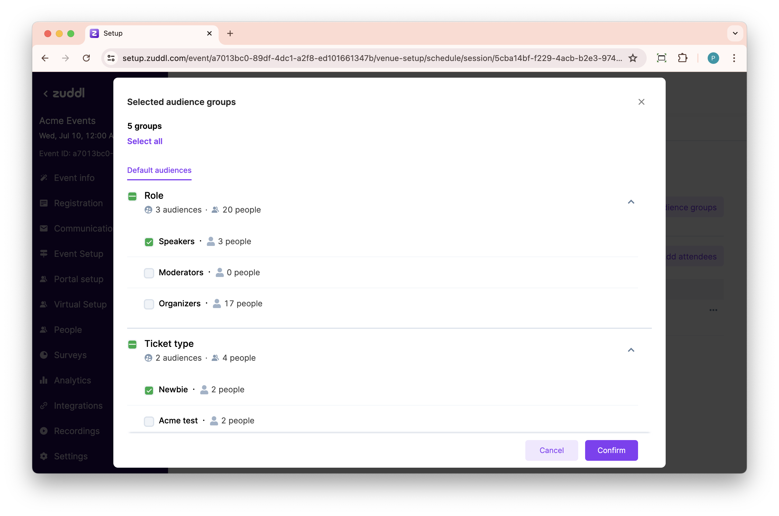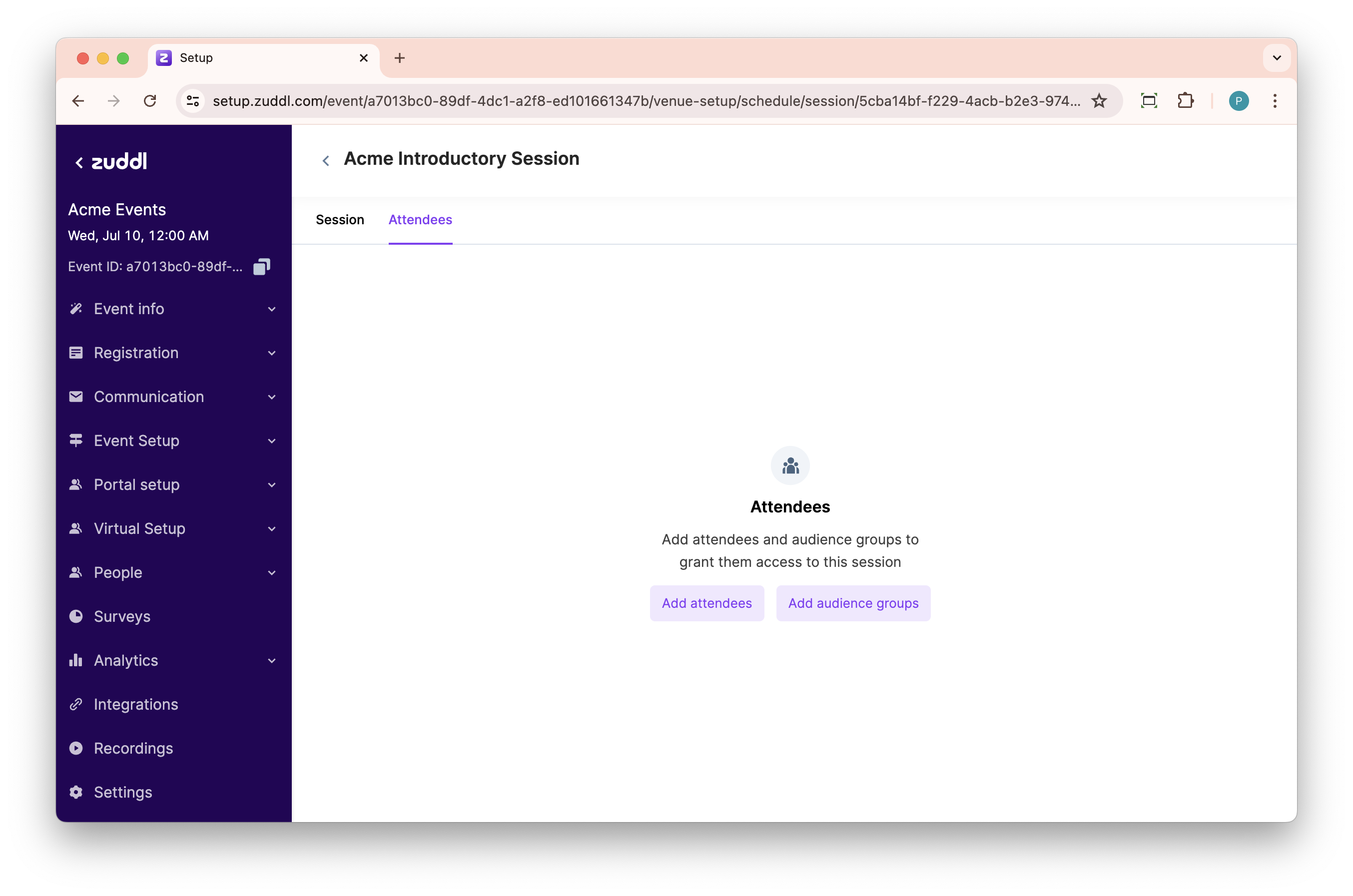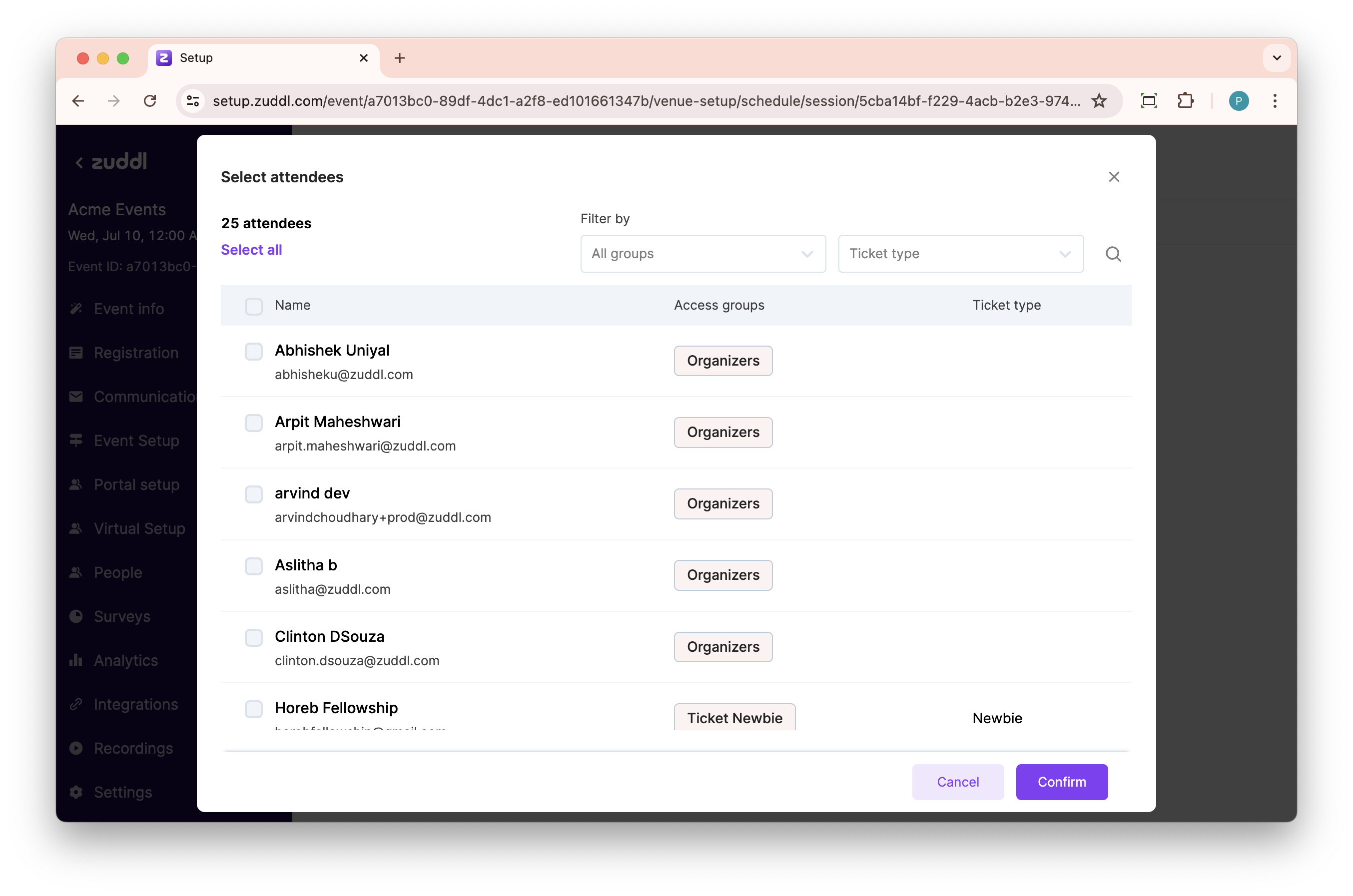 Click on Add attendees button to select attendees by their name, email address, Audience group, or ticket type.