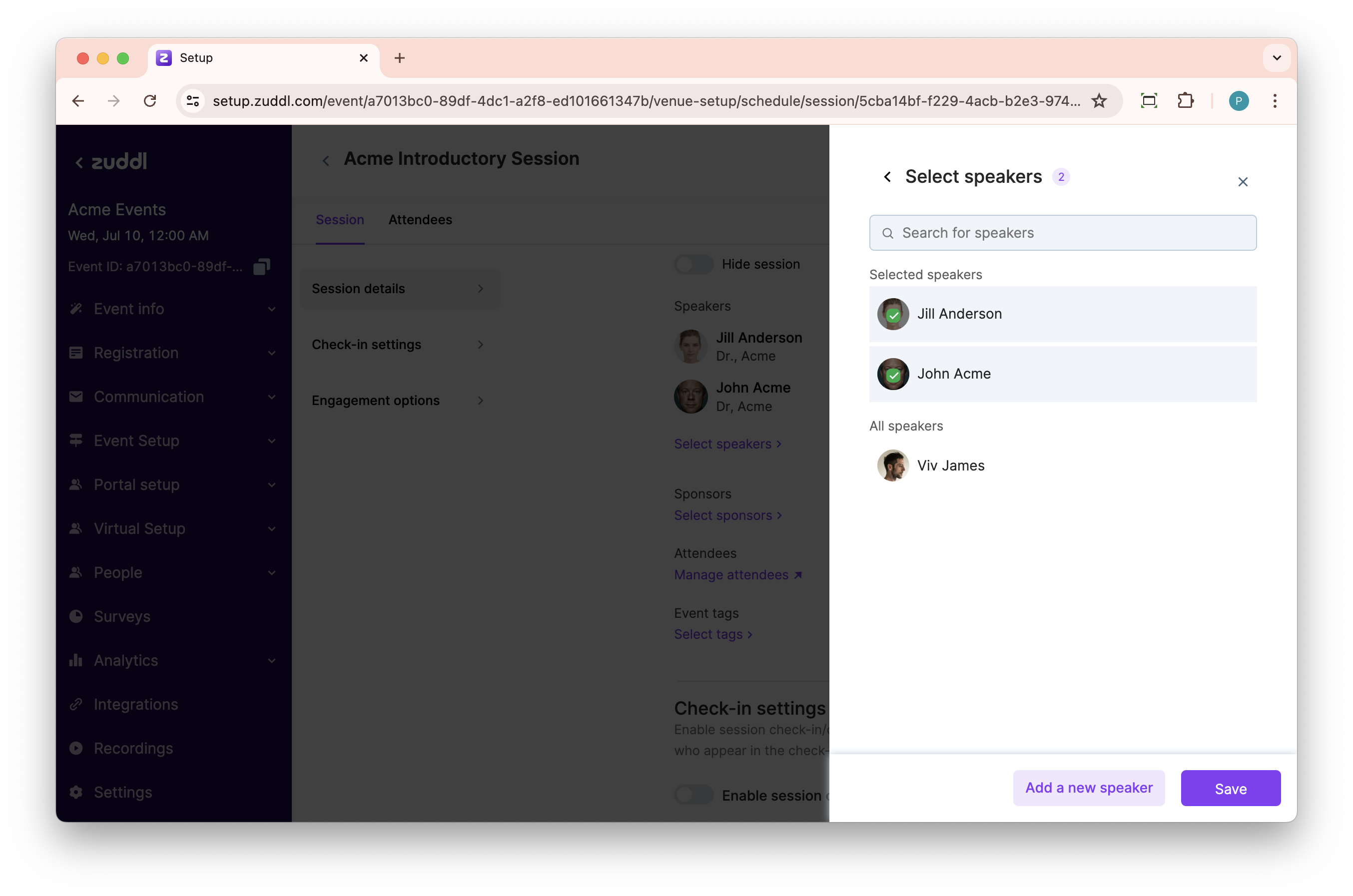 Click on the Select Speakers link, search and select the speakers from the list. You can also add new speakers by clicking Add a speaker button. Learn how to add a speaker.