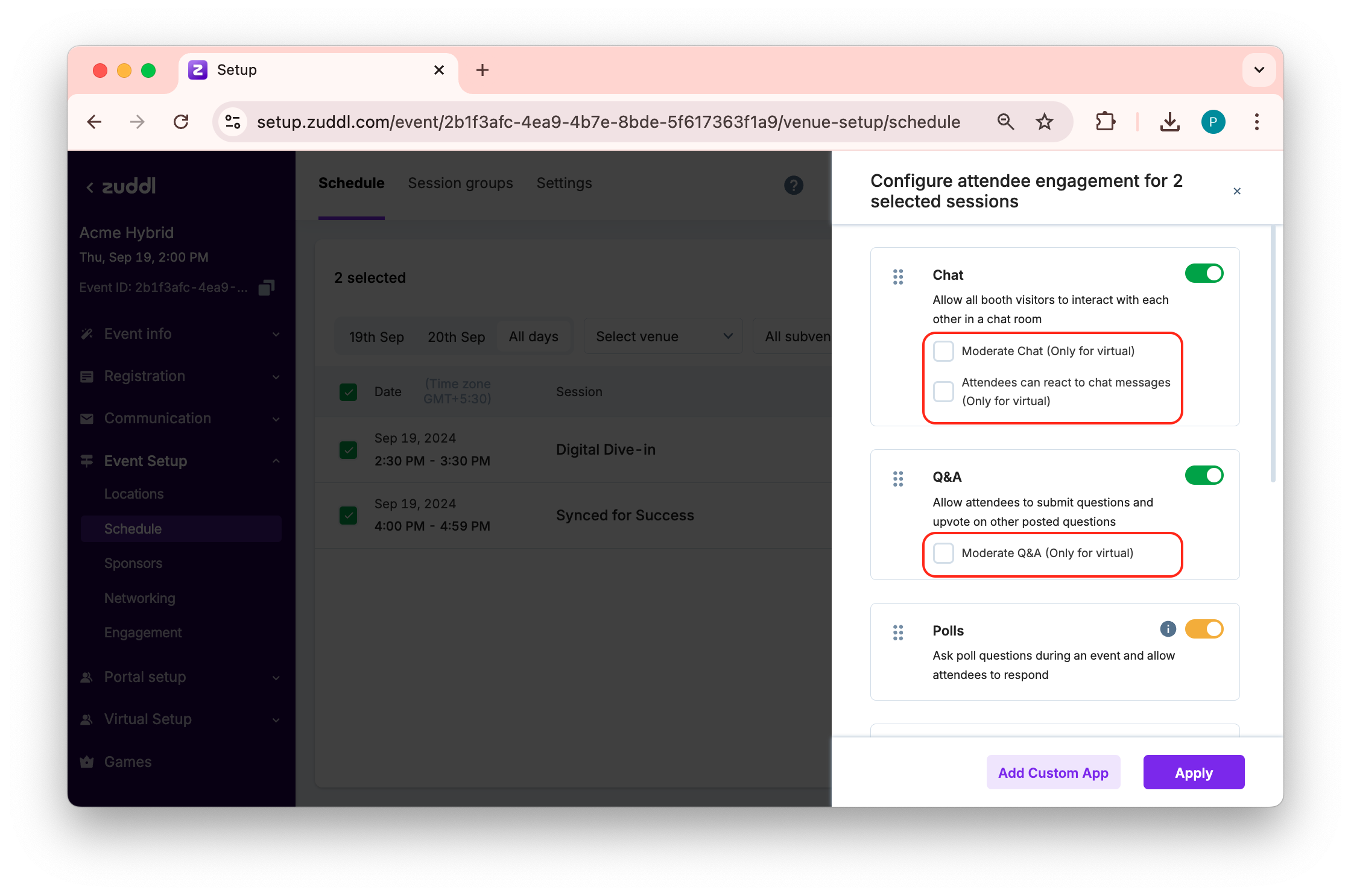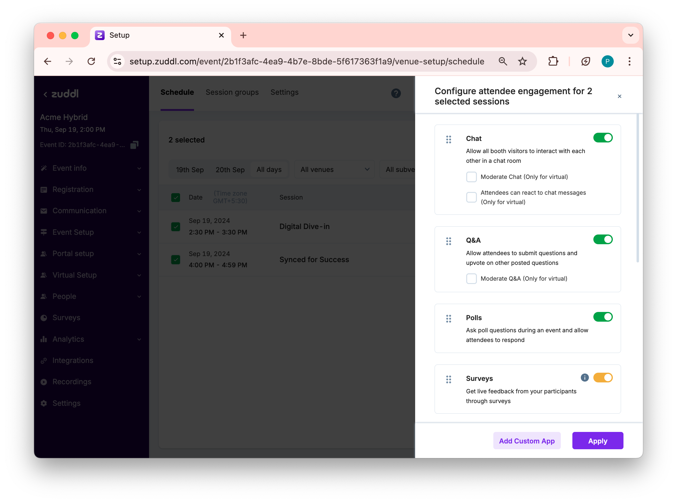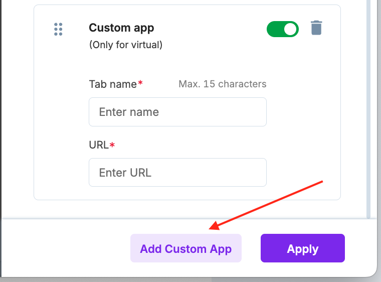 You can also click Add custom app button to add iframe line for a custom app for session engagement.